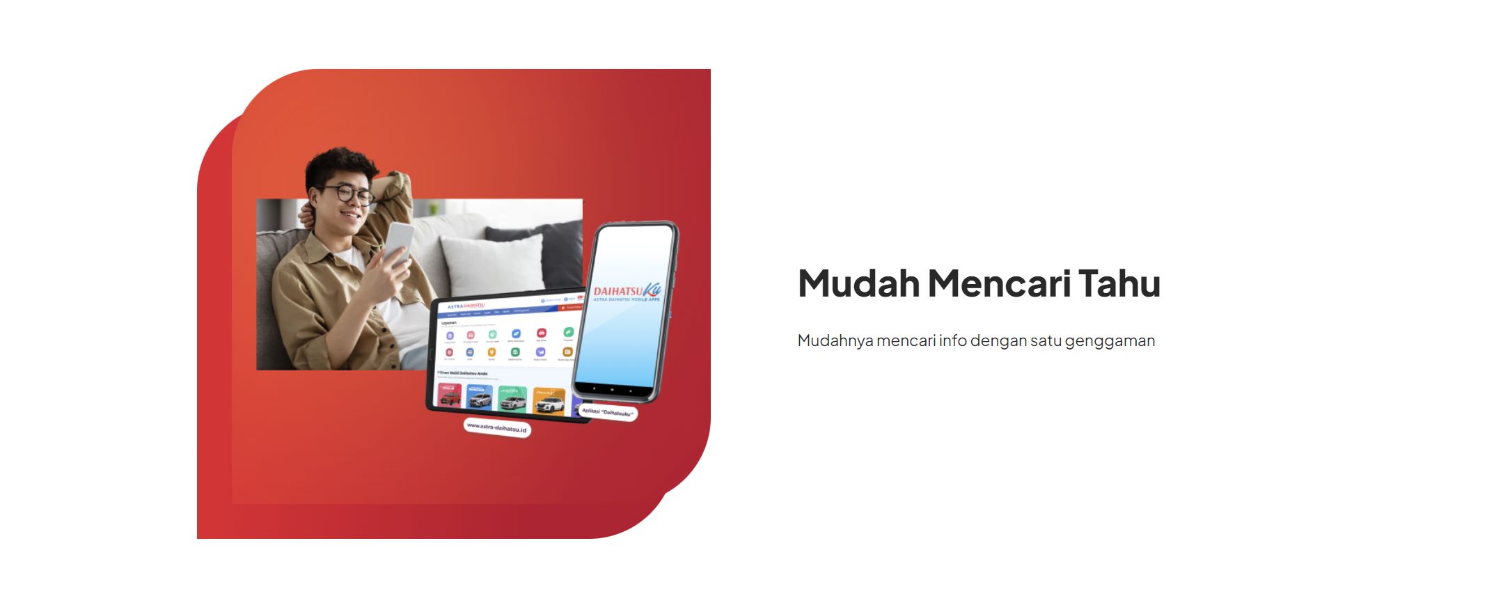 Mudahnya mencari info dengan satu genggaman. Ingin tahu lebih banyak tentang mobil Daihatsu impian Anda? Dengan Daihatsu, mencari informasi tentang produk kami jadi semakin mudah. Kami menyediakan berbagai sumber informasi yang lengkap dan mudah diakses, mulai dari spesifikasi teknis, fitur unggulan, hingga galeri foto dan video. Anda bisa menemukan semua yang Anda butuhkan hanya dengan beberapa klik.